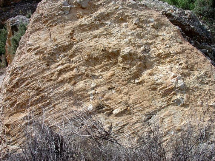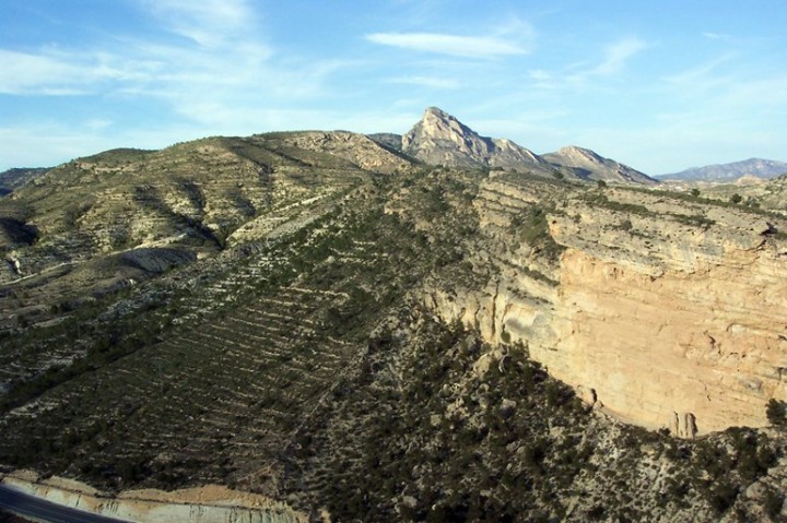 A la izquierda el arrecife del cabezo del Sastre (o del Desastre), donde se localiza el arrecife coralino que generó el talud arrecifal (a la derecha). Al fondo la sierra de Corque