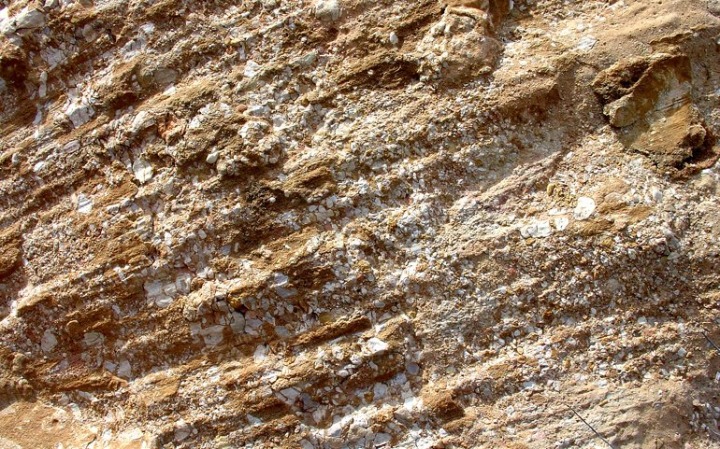 Detalle del espejo de falla donde ser observan: estrías, acanaladuras, escalones, recristalizaciones y harina de falla.