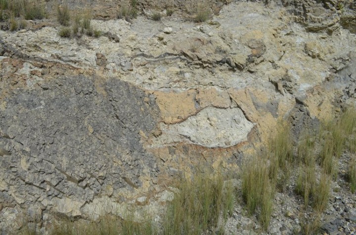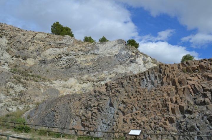 Detalle del pitón volcánico con la disyunción columnar y las paredes de la cantera con los piroclastos y las coladas