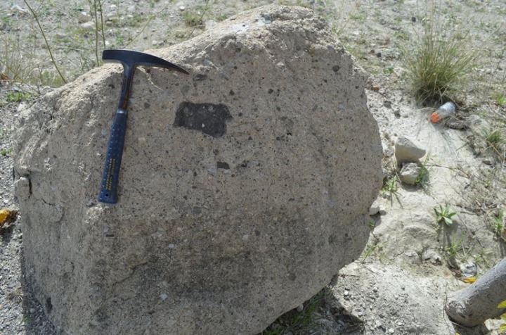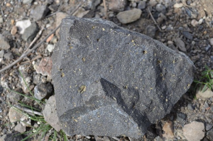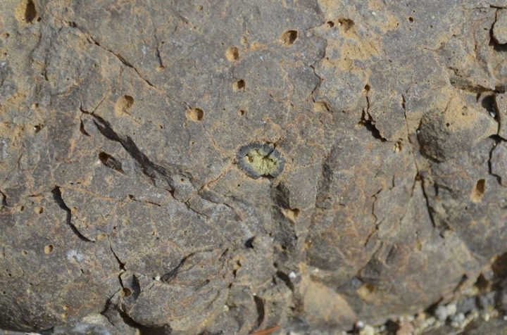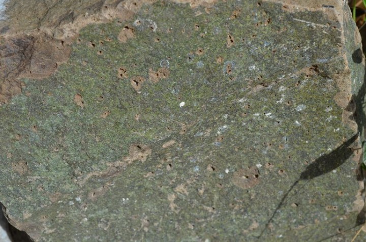Lamproita vesicular de Calasparra, con un fragmento de peridotita de color verde rica en olivino, una dunita