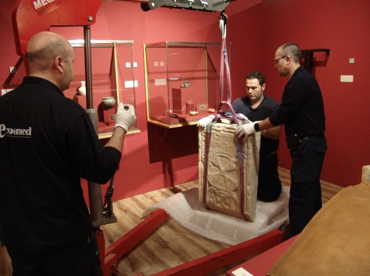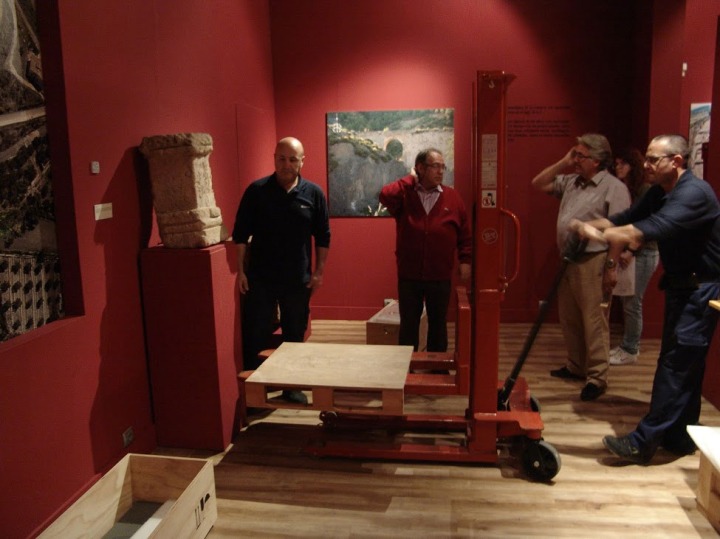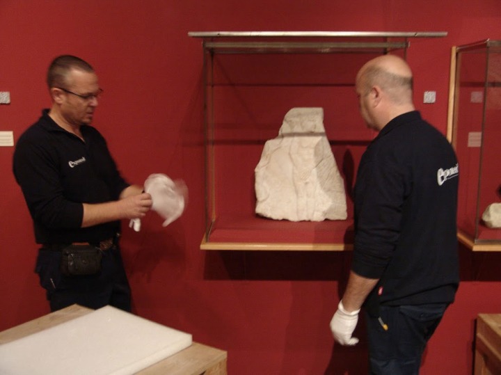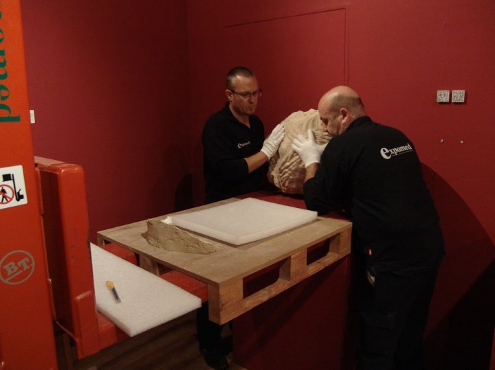 Operarios usando maquinaria para bajar la pieza de su pedestal.