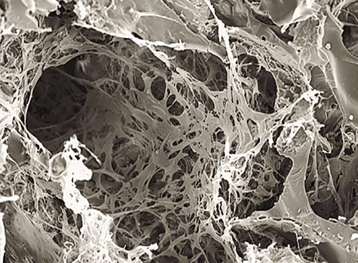 El proceso termina por producir una estructura bidimensional, con el aspecto de un papel que se ve al microscopio como un fieltro o malla de fibras ultrafinas desordenadas.