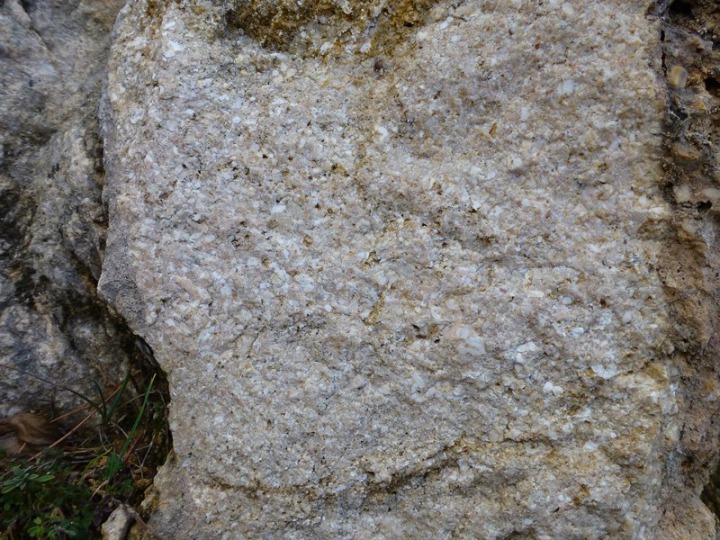 Detalle de las calizas bioclásticas que forman el Rincón de las Cuevas. Son rocas constituidas por fragmentos de conchas y caparazones de fósiles marinos, lamelibránquios y erizos