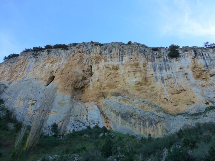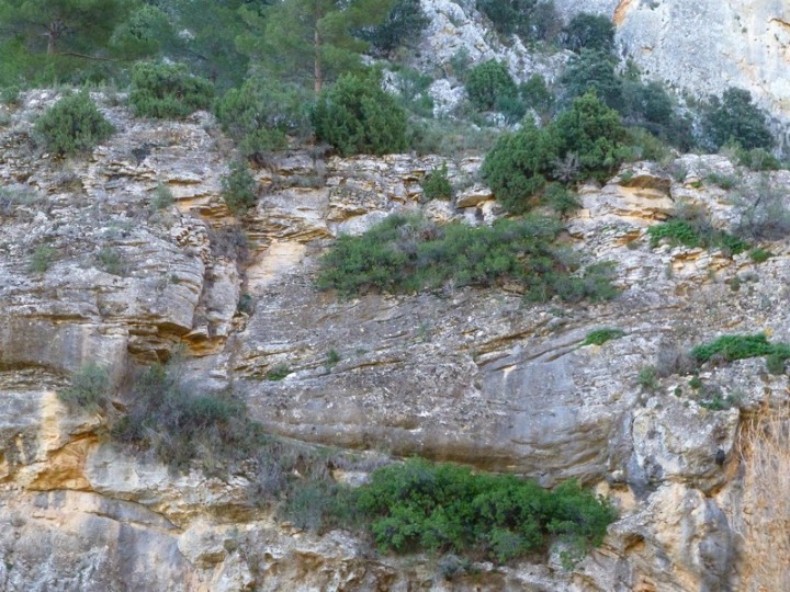 Detalle de una pared vertical del Rincón de las Cuevas, aquí se denominan cenajos, en la que se ven los estratos alabeados por el movimiento del sedimento marino y oquedades por disolución