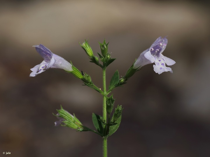 Mata perenne, sufruticosa, de tallos lignificados, aunque muchos bastante finos, de hasta 70-80 cm de altura, por lo general pelosos, pero también casi sin pelos, con ramificaciones irregulares, que le dan aspecto muy variable a la planta, con frecuencia desgarbado. Hojas verde oscuro, de hasta 4 cm, pero comúnmente de 1-1,5 cm, enteras o algo dentadas y, entonces, dientes dirigidos hacia el ápice, con pilosidad al menos en el envés o en los nervios de éste. Flores pediceladas, agrupadas en inflorescencias de tipo verticilastro o, también, en cimas, con cáliz acampanado, glanduloso, y corola bilabiada, alargada, de hasta 1,5 cm, con tubo y cilios (pelos alargados y transparentes), violácea o teñida homogéneamente de púrpura apagado; garganta blanquecina y pequeñas manchas, de color más intenso, en los dientes inferiores, mayores que el lóbulo superior. Fruto de tipo núcula, globosa, de aproximadamente 1 mm, marrones.