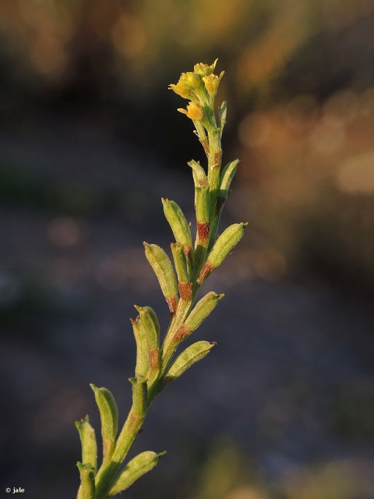 Planta herbácea, anual, de tallos o muy cortos y postrados, reptantes, pegados al suelo, de apenas uno o unos centímetros, o bien ascendentes, erguidos pero curvados, de hasta 30 cm, entonces incluso muy numerosos. Hojas de casi lanceoladas a linear-lanceoladas, más estrechas en la base, verdes, con nervio central más claro, cubiertas de pelos cortos dispersos, de 1-2,5 cm. Flores diminutas, agrupadas en racimos densos, con pétalos mínimos, amarillos, de 1-2 mm. Infrutescencia alargada, con flores cuando los primeros frutos, de tipo silicua, están inmaduros, muy característicos, de hasta 1 cm, cubiertos de pelos cortos y casi pegados a la superficie, finalizados en dos cortas expansiones triangulares, de 1 mm, que tienen apariencia de pequeños cuernos.