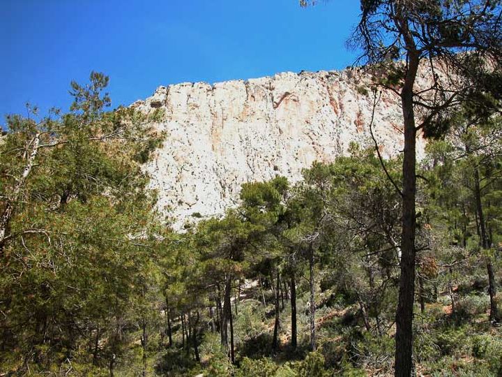 Detalle de la verticalidad de las Parede de Leyva, paraiso de escaladores y zona de hábitat del búho real y el hálcón peregrino. P. R. Sierra Espuña.