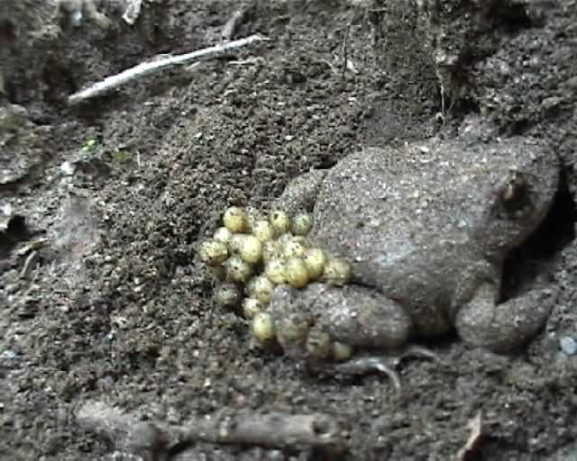 Una vez son depositados por la hembra, el macho los recoge entrelazándolos en sus patas posteriores y los fecunda. Después se separan y el macho queda al cuidado de los huevos, saliendo cada noche a remojarlos para impedir su desecación. Cuando el renacuajo está perfectamente formado, aprovecha uno de sus baños nocturnos para abandonar a su progenitor e iniciar su vida libre en el agua. Permanece desde cuatro meses a todo el año en el agua.