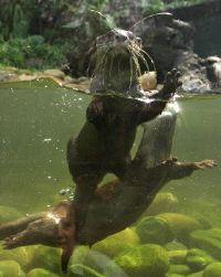 Acude a pequeños riachuelos cuando se secan, para alimentarse de ranas y peces que quedan allí aislados. Cuando está fuera del agua se desplaza a saltos, lentamente, y por el río, va haciendo zig zag de una orilla a otra, jugando constantemente. Tienen una buena vista bajo el agua (mejor que fuera de ella), y el oído y olfato son muy finos.