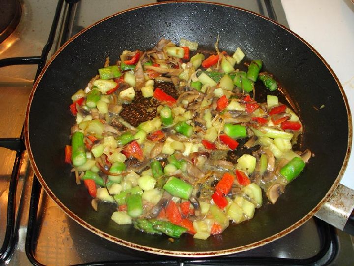 Una vez caliente la sartén. Pochar los ajos laminados y los espárragos trigueros en el aceite. Añadir los calabacines cortados en cubitos pequeñitos, dejar que se ablanden un poco. Echar los champiñones limpios y cortados en juliana, remover unos minutos hasta que los champiñones empiecen a ablandarse. Añadir los pimientos cortados en tiras, el perejil picado, dejar hacer a fuego lento hasta que todo esté tierno.