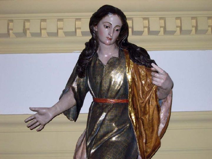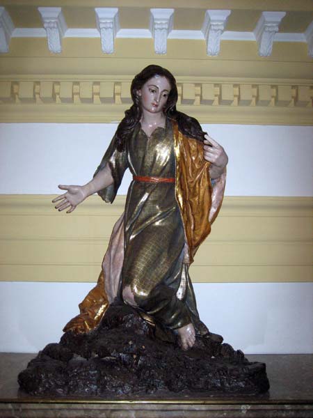 La Santa penitente, confundida por muchos con la Magdalena. Con cabello largo y aireado al viento, inclina su cabeza hacia un lado para mirar un crucifijo que hoy esta desparecido. Esta arrodillada, sobre un montículo rocoso. A ambos lados aparecían antiguamente dos angelitos.
