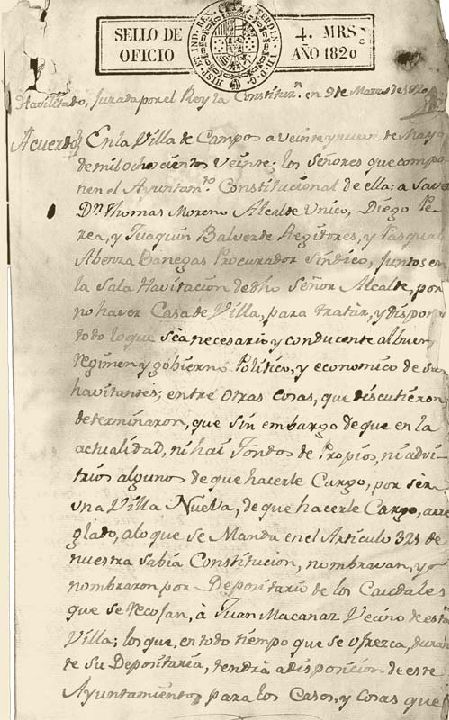 En 1812, tras las Cortes de Cádiz, se constituye el Ayuntamiento de Campos del Río (llamado por entonces Campos). La villa recibió el nombre de Campos de Mula. Con la restauración del absolutismo se suprimió este Ayuntamiento, volviendo a constituirse en 1836.