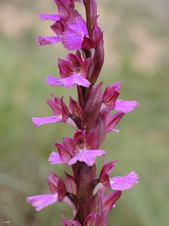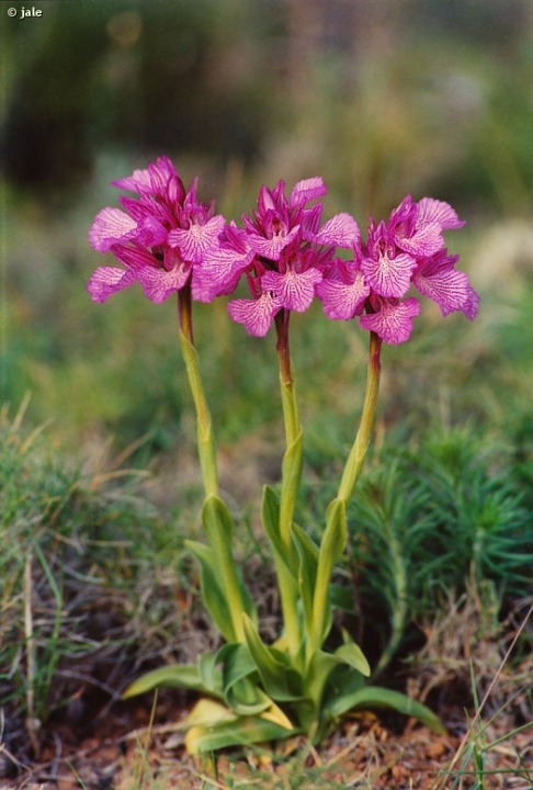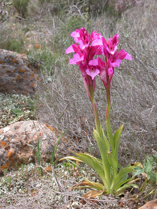 Planta herbácea y perenne, de hasta 35 cm. 3-6 hojas en roseta basal, linear-lanceoladas, de 7-15 cm de longitud, sin manchas. Varias hojas caulinares. Inflorescencia con 5-15 flores de rosadas a purpúreo-rosadas. Flores de simetría zigomorfa, sépalos y pétalos conniventes en forma de capuchón. Labelo de 2-3 cm de anchura, con trazos y manchas longitudinales rosado-purpúreas, margen algo ondulado. Espolón corto. Fruto en cápsula.