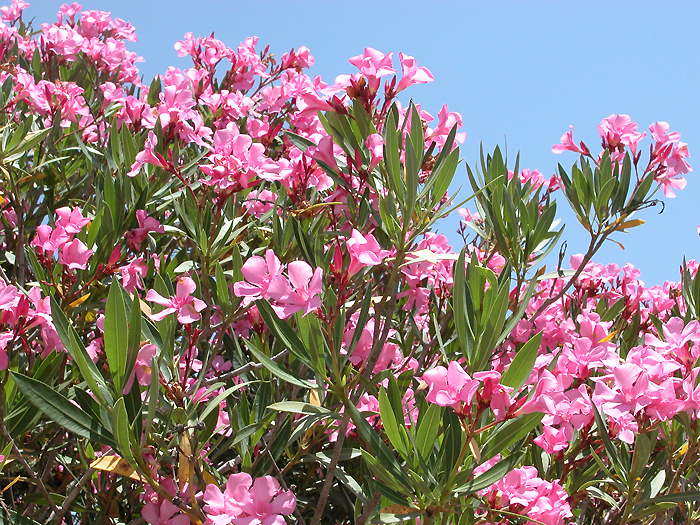 Arbusto perenne, alto, hasta 3-4 m de altura. Tallos rectos, erguidos, grisáceos. Hojas linear-lanceoladas, de 6-12 cm, de color verde oscuro, nervio central más claro, muy marcado en el envés. Flores de 4-6 cm de diámetro, rosadas, cinco piezas, soldadas en su base a modo de tubo, con 'coronula' que cierra la garganta, agrupadas en corimbos terminales. El fruto es un folículo alargado, de 8-15 x 1-2 cm, que se abre por una línea de dehiscencia longitudinal. Las semillas presentan un penacho de pelos apicales para su dispersión por el viento.