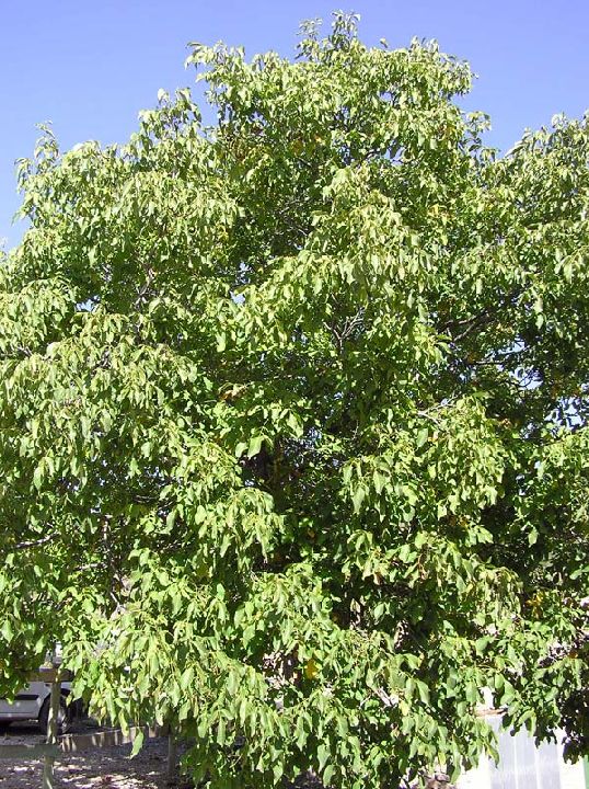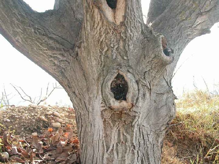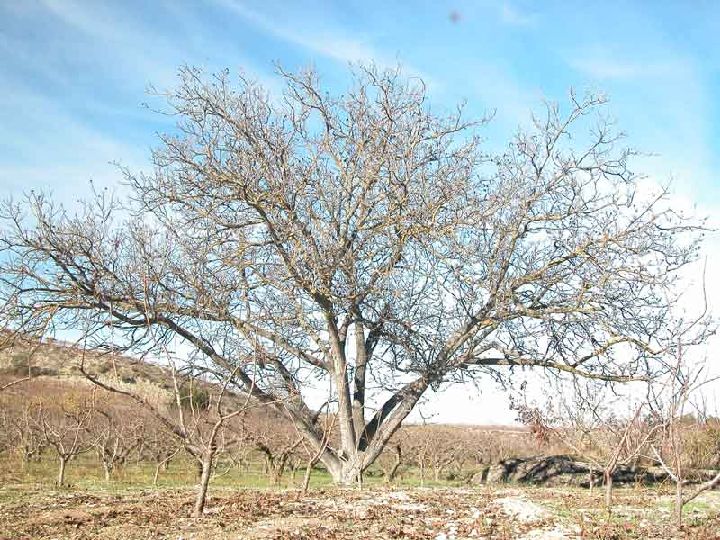 El nogal es un árbol de fronda de hasta 30 m. de alto, de tronco muy poderoso y copa amplia y densa, de vigorosas y corpulentas ramas. La corteza del tronco es de color grisáceo a pardo oscuro, suberosa y con grietas muy pronunciadas.