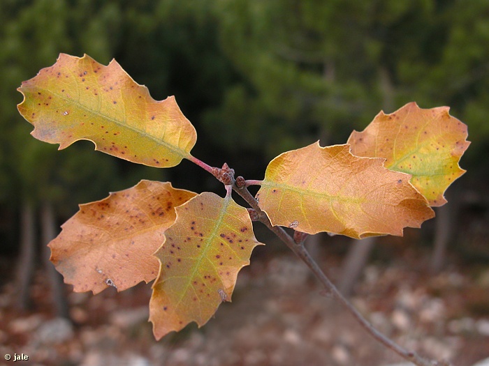 Las hojas son oblongas aovadas simples, dentadas-lobuladas, con lóbulos poco profundos y generalmente agudos. Son de color verde oscuro por el haz y más pálidas por el envés con algo de pilosidad. En otoño se ponen amarillas pero no se caen hasta la primavera siguiente. Entonces se sustituyen por otras nuevas.