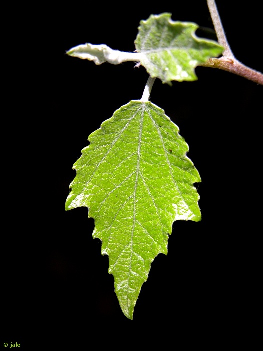 La forma de las hojas es muy variada, y en el mismo árbol podemos encontrar hojas lobuladas y sin lobular, triangulares, etc. El haz de las hojas es de un verde lustroso, mientras que el envés es piloso y blanco.