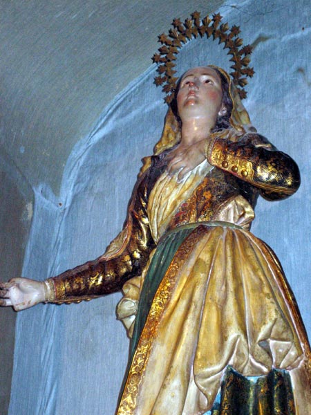 Se trata de la imagen de Santa María de la Cabeza, esposa de San Isidro Labrador. Presenta el brazo izquierdo doblado, apoyando su mano sobre el pecho. Por el contrario el brazo derecho rompe la composición cerrada, despegándose totalmente del cuerpo. Lo que da lugar a una composición abierta. Sujeta con la mano derecha una antorcha, objeto con el que alumbra el camino a lo largo de la madrugada para asistir a la primera misa del día.