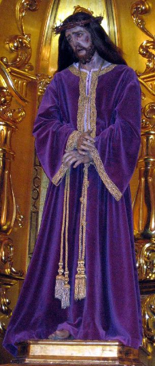 Se trata de la imagen de Cristo camino del calvario para ser ejecutado. En el cuello lleva un cordón a modo de soga que cuelga prácticamente hasta los pies. El rostro abatido y ensangrentado. El pelo es un postizo, cae la larga melena hasta mitad de la espalda. Remata la cabeza sujetando el cabello, la corona de espinas.