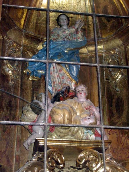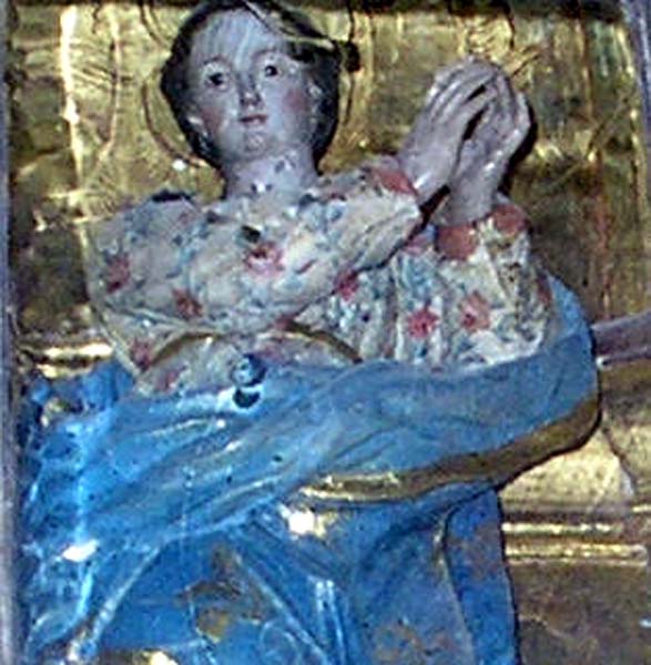 Talla realizada en madera policromada, se alza sobre una bola que simboliza el Mundo. La serpiente que observamos hace alusión al pecado original que ha causado los males que padece la Humanidad. En torno a sus pies una nube con angelotes conforman la peana.