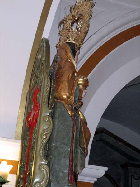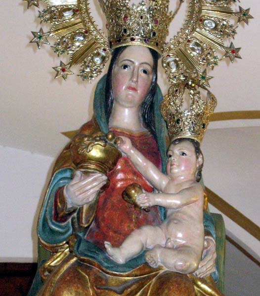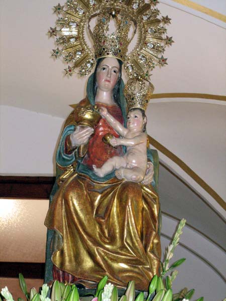 Se trata de la imagen de la Virgen, junto con el Niño que está desnudo y colocado sobre la antepierna izquierda de la Virgen. La figura del Niño no es frontal, está dispuesto de lado y gira la mirada hacia el lateral. Con la mano derecha se estira para intentar coger una fruta del cesto que lleva la Virgen con peras, manzanas y granadas. Con la otra mano ofrece dicho fruto al devoto que lo contempla.