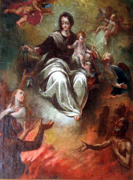 Se trata de la representación de la Virgen del Carmen, la cual está sobre una nube. Sostiene en su regazo y sobre la antepierna derecha la figura del Niño. La imagen de la Virgen sorprende por su gran monumentalidad con relación al tamaño del lienzo. Es de mirada noble, muy dulce. Está colocada de frente, pero gira la cabeza hacia la derecha mirando el alma abatida que alarga su mano desde el purgatorio para coger uno de los atributos que sostiene la Virgen con su mano derecha. La imagen del Niño, está desnuda, aunque un paño le envuelve de atrás hacia delante. La figura del Niño está posicionada de forma lateral. Dirige éste su mirada hacia abajo, no se sabe bien si hacia los ángeles que le rodean o hacia las almas abatidas del purgatorio.