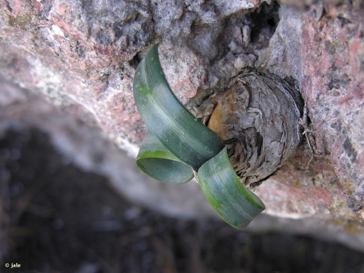 Comenzaremos a ver sus hojas acintadas tras la floración, en ocasiones incluso mientras ésta se produce, hasta bien entrada la primavera, tan características y fácilmente reconocibles por su franja longitudinal más clara. En los otoños lluviosos el haz de hojas es más numeroso y el tamaño de éstas considerablemente mayor, circunstancia que evidencia la adaptación de la planta a producir y acumular reservar en su órgano subterráneo durante las puntuales épocas favorables. A pesar de la vistosidad de sus flores, estas son demasiado pequeñas, efímeras y tardías, por lo que carece de nombre común de uso local en Murcia y allá donde se presenta [motivo por el que se la “bautizó” aquí como Flor de la estrella, en septiembre 2005, nombre que se ha extendido por páginas de Internet y documentos en papel, hasta en informes técnicos].