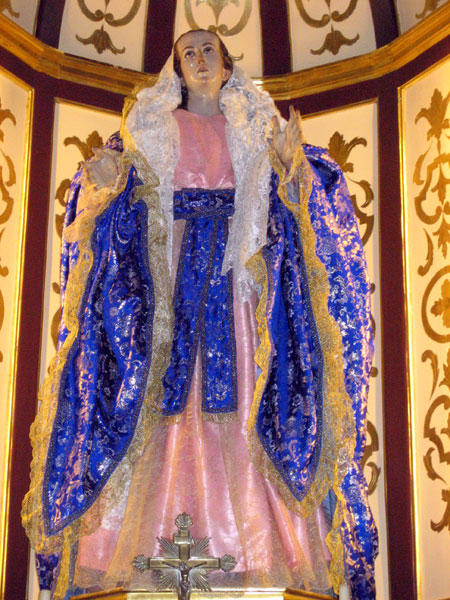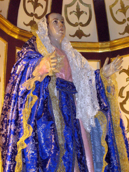 Esta ataviada con una túnica o vestido de color rosa con bordados en oro. Por encima de la túnica, un precioso manto de color azul, bordado con motivos florales en dorado, rosa y blanco con la terminación en puntilla dorada. Sobre la cabeza una mantilla blanca.