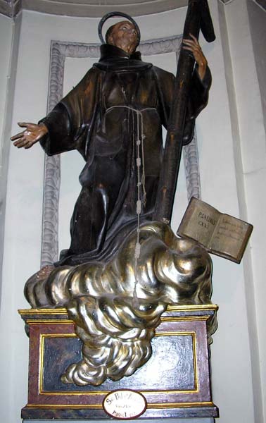 Esta colocado de lado, casi de rodillas, sobre una nube. Su cuello se gira hacia la derecha. La mirada fija hacia la cruz que sostiene con su mano izquierda. La composición se abre mediante el brazo derecho, totalmente despegado del cuerpo. Viste habito marrón oscuro, este le llega prácticamente hasta los pies. No obstante se pueden ver estos desnudos, sin ningún tipo de sandalia.