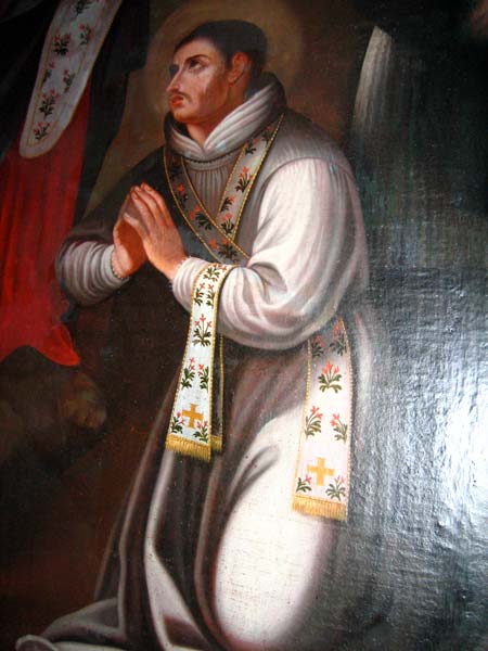 A los pies del cuadro figura una leyenda, y en el ángulo inferior derecho se encuentra el bastón o báculo y la mitra, símbolos de su dignidad obispal.