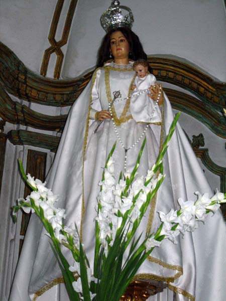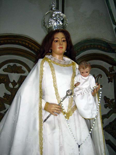Esta colocada de frente, con la cabeza ligeramente inclinada hacia el lado derecho. Es una composición cerrada en la que el brazo izquierdo sostiene la figura del Niño, acurrucándolo hacia el pecho. Entre los dedos aparece un rosario, que da la sensación de estar siendo contado por María, quien con la otra mano sostiene la vara imperial como reina de los cielos.