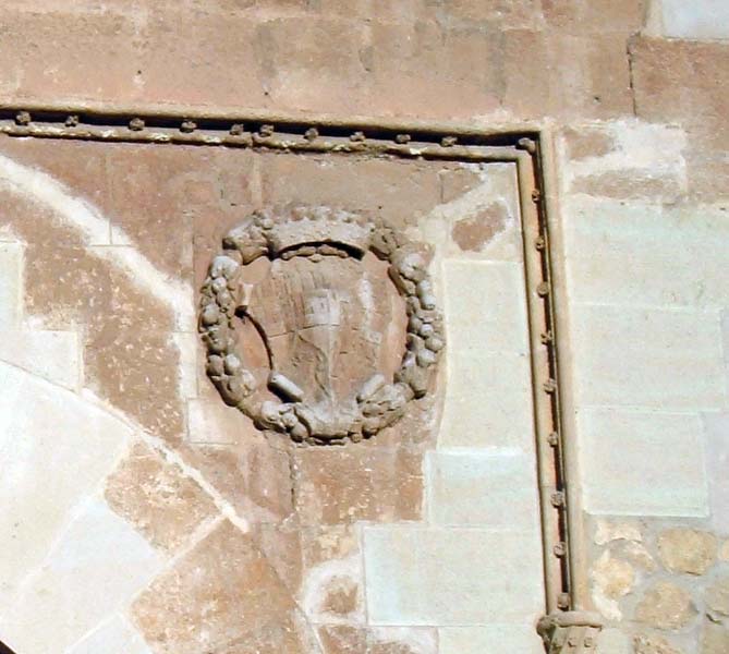 Este escudo pertenece a la casa nobiliaria de los de Villena y se encuentra en la fachada de la iglesia, una bella pieza de sillería, muy bien labrada, con alfiz y dos escudos.