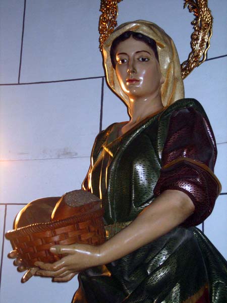 Es una figura , esta colocada de frente, aunque tiene diferentes puntos de perspectiva. Lleva la pierna derecha más avanzada que la izquierda, y entre sus manos sostiene un cesto con panes.