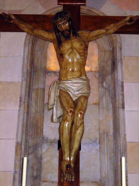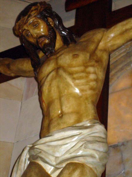 La figura de Cristo esta clavada en la cruz mediante tres clavos. Uno para cada una de las manos y otro para los pies. Esta colocado de frente, con los brazos arqueados hacia arriba. La cabeza esta inclinada hacia abajo y girada levemente hacia la derecha. Los ojos entreabiertos, ya sin vida. Se corresponde con el momento en el que Cristo tras ser untado en sus labios con una esponja empapada de vino agrio, se da cuenta de que se ha realizado todo lo que su Padre lo envió a hacer en la Tierra, de modo que se encomienda a Dios, inclinando la cabeza y falleciendo.