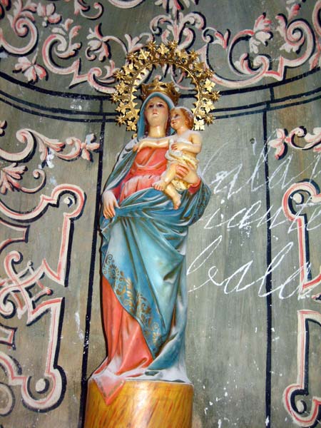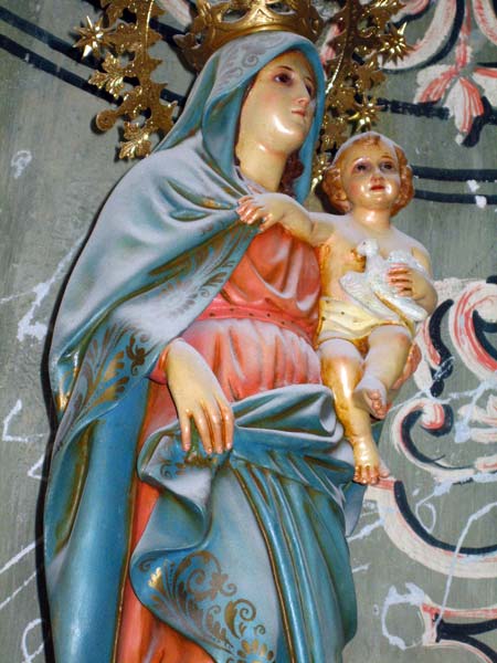 Se encuentra vestida con túnica roja y manto azul verdoso recogido con su mano derecha sobre una de sus caderas, en los bordes de este manto se aprecian unas cenefas de color oro. En la otra mano porta al niño de piel rosada que aparece envuelto en un paño y sujetando con su mano izquierda, a la altura de su pecho, la paloma símbolo del Espíritu Santo y apoyando su otra mano suavemente sobre el pecho de su madre. Sobre la cabeza la Virgen lleva una corona y una aureola decorada con estrellas y hojas.