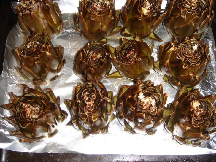 También resultan muy sabrosas y entretenidas de comer asadas. Para ello simplemente cortaremos los rabos procurando que queden a nivel, es decir lo más horizontales posibles, de manera que podamos poner las alcachofas de pie en la bandeja del horno. Para aliñarlas bastará salpimentar en su parte superior y luego chorrear de aceite. Estos ingredientes se empaparán entre las hojas, proceso que se verá favorecido con la apertura de las alcachofas durante el asado. De este modo realizamos un asado externo-cocido del corazón en su propio jugo. Estarán listas, con el horno a máxima potencia (230-250 ºC), cuando al pincharlas en su base estén blandas –aproximadamente en una hora–, personalmente me gustan más al estilo como los italianos cocinan la pasta, 'al dente'. No debe asustarnos que las hojas externas se quemen, su aspecto será deplorable, pero su sabor exquisito. Se comen hoja a hoja mordisqueando la base de las mismas hasta que llegamos al ansiado corazón protegido por las hojas más tiernas y blancas.