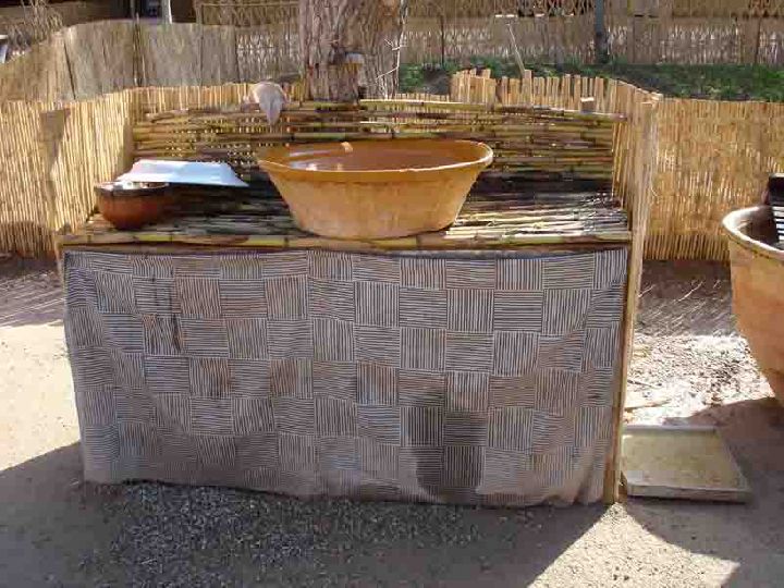 Como la benignidad climática se instalaba en la Huerta de Murcia durante gran parte del año, las huertanas cocinaban al aire libre en un fogón cercano a la vivienda y protegido por un sencillo tambalillo de cañas.