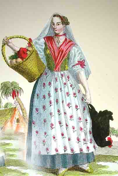 Las prendas exteriores eran la chambra o blusa de batista o lino blanco, el corpiño, de raso y terciopelo negro el de diario, y de raso crema o blanco con bordados de lentejuelas y cuentas de cristal, el de fiesta. Sobre los hombros caía el mantoncillo y en el traje de lujo se empleaba la mantela. La prenda más vistosa del traje femenino es el refajo o falda, casi siempre hecha de paño o bayeta de lana. Sobre ésta caía el delantal.