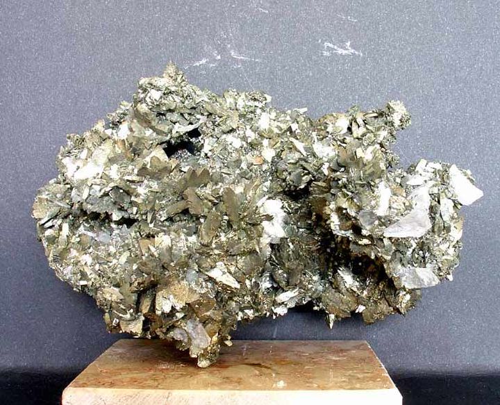 Polimorfo de la pirita que suele aparecer en masas, agregados radiales, nódulos y más típicamente en cristales prismáticos maclados en punta de espada o cresta de gallo, y en agregados en forma de coliflor. Su color pálido lo distingue de la pirita, que en fracturas recientes es casi blanco, por lo que también se la conoce como pirita de hierro blanco. Cuando aparece en agregados microgranulares, nódulos o masivo y está algo alterada resulta muy difícil poder distinguirla de la pirita a visu.