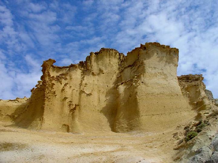 Cuando los estratos de arenisca poseen cierta inclinación y aparecen intercalados entre margas dan lugar a paisajes en cuesta (Molina de Segura, Fortuna, Abanilla, Ulea, Blanca, Mula, Lorca, etc.). Si los estratos están verticales, originan modelados en cresta (Sierra de la Espada, Molina de Segura).