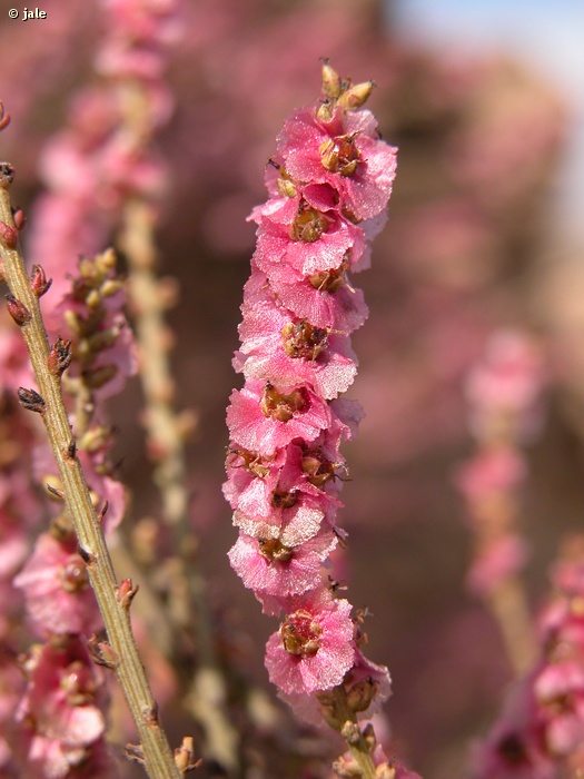 Pequeño arbusto de hasta 1 m, con raíces principales gruesas y profundas, que se continúan en una enmarañada red de pequeñas raicillas sucesivamente muy ramificadas y divididas, de color blanco-amarillento. Tallos delgados, estriados, pardos o prácticamente negros, intrincados, los jóvenes verdes, desarrollándose en el extremo de los anteriores, con hojas, lineares, cortas, de 0,5-1 cm de longitud. Inflorescencia espiciforme, de flores en densos y largos grupos al final de las ramillas. Flor poco vistosa, hermafrodita, de simetría pentámera, en la que no se diferencia cáliz ni corola, sólo cinco piezas (tépalos), entre los que se encuentran los cinco estambres, el órgano más desarrollado y claramente reconocible. Durante la formación de los frutos, los tépalos continúan creciendo, y se desarrolla un ala subcircular membranosa de color llamativo, en la gama del rosado-purpúreo, de intensidad variable y en ocasiones hasta blanquecino-verdosa.