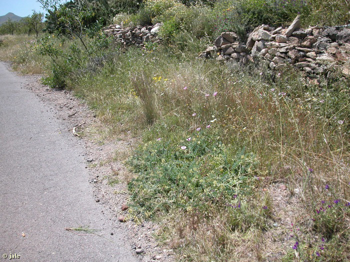 Herbazales secos, por lo general sobre sustrato pedregoso, en suelos poco profundos y relativamente nitrificados, de origen volcánico, que se encuentran en un territorio de “cultivos tradicionales con laboreo mínimo”. Planta endémica del sur de la Región de Murcia, que cuenta con una única población al oeste de la ciudad de Cartagena, constituida por cuatro subpoblaciones (Pérez Bajos, Cabezo Negro de Tallante, Cabezo Blanco y Cabezo Negro de los Pérez).