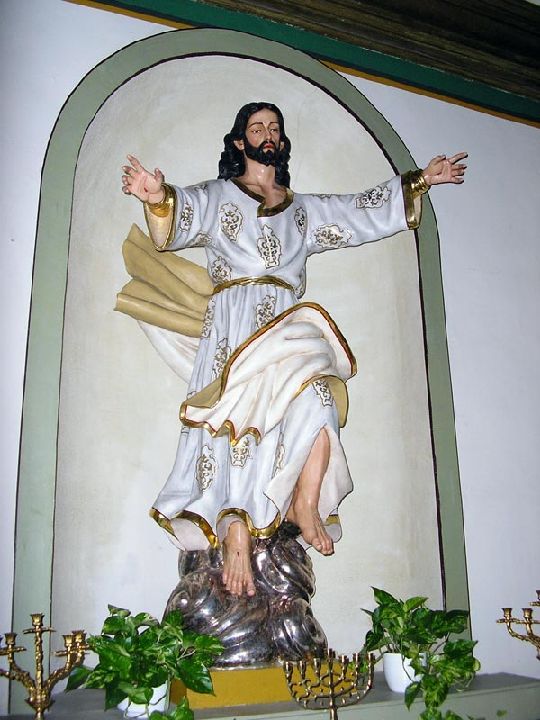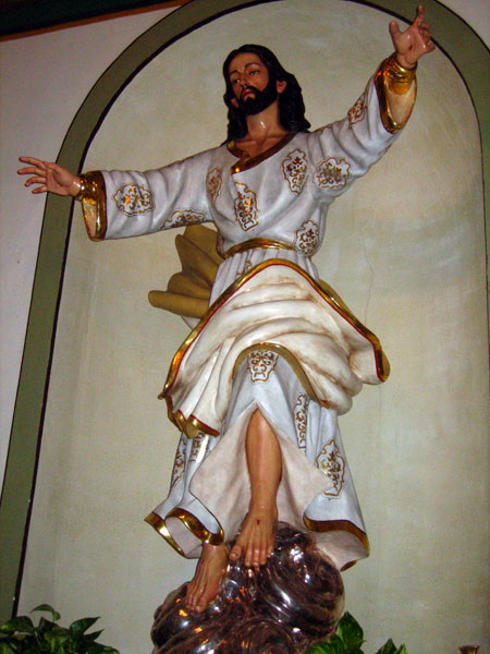 Se trata de la figura de Cristo Resucitado. Está colocado de pie y de frente con los brazos abiertos y en actitud de caminar. Se alza sobre un pedestal en forma de nube plateada, dando la sensación de volar más que de andar.