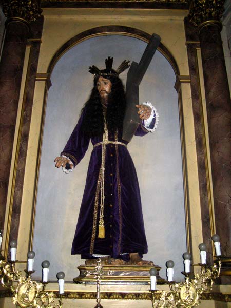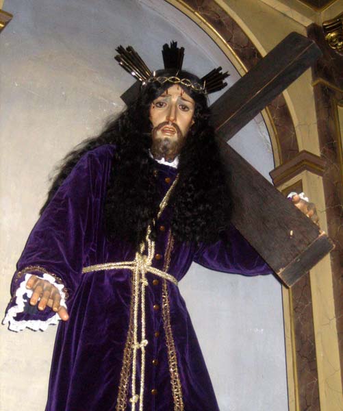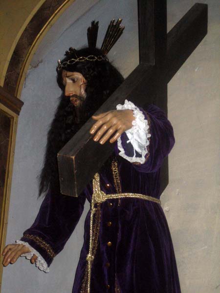 Esta colocado de frente, en actitud de andar. A la altura de la cintura se produce un giro del cuerpo, hacia el lado derecho. Para que la cruz, tenga un mayor apoyo, Cristo vuelve la cabeza hacia el lado derecho. La cruz está compuesta de dos maderos transversales, con forma rectangular. Jesús aguanta con la mano izquierda el madero transversal de la cruz, mientras que con la mano derecha hace un ademán acorde con el paso que lleva. El rostro, es triste, delgado, pero bello. Sus ojos son grandes y hermosos. Sus cejas están arqueadas, y son muy finas. La nariz, es fina y alargada. La boca esta entreabierta, pudiendo ver los dientes y la lengua. Una larga cabellera cae hasta por debajo del pecho. Es una peluca, demasiado voluminosa para la cara tan fina. La figura en si, es delgada. Se ve con poco volumen. Incluso la túnica que viste tiene poco vuelo.