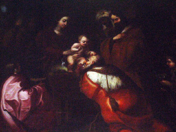 Cuando estos entraron vieron a María, con el Niñito y cayendo le rindieron homenaje. También abrieron sus tesoros y le presentaron regalos: oro, olíbano y mirra. Esta ultima parte es la que se escenifica en el lienzo que nos ocupa.