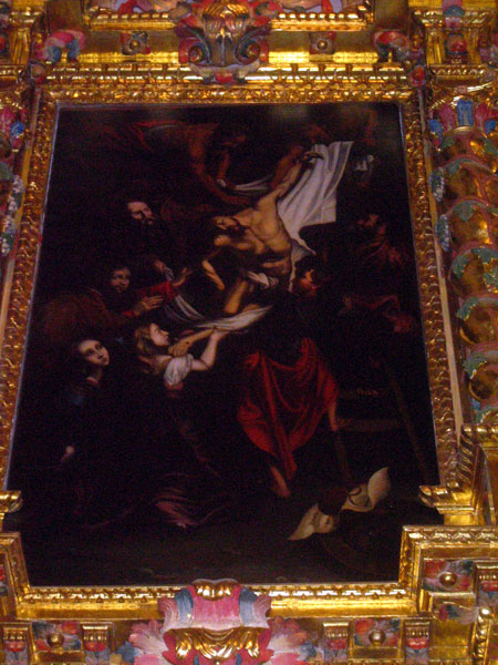 El lienzo que alberga el ático del retablo es una copia del 'Descendimiento' de Pedro Pablo Rubens, pintado en 1614, y que se muestra en la Catedral de Amberes.