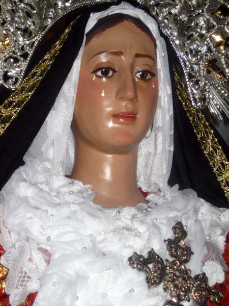 María esta ataviada con un vestido rojo, con adornos en dorado. Lleva una mantilla blanca, y sobre sus rodillas un amplio paño también blanco. Es la sábana que sirve de sudario a Cristo.
