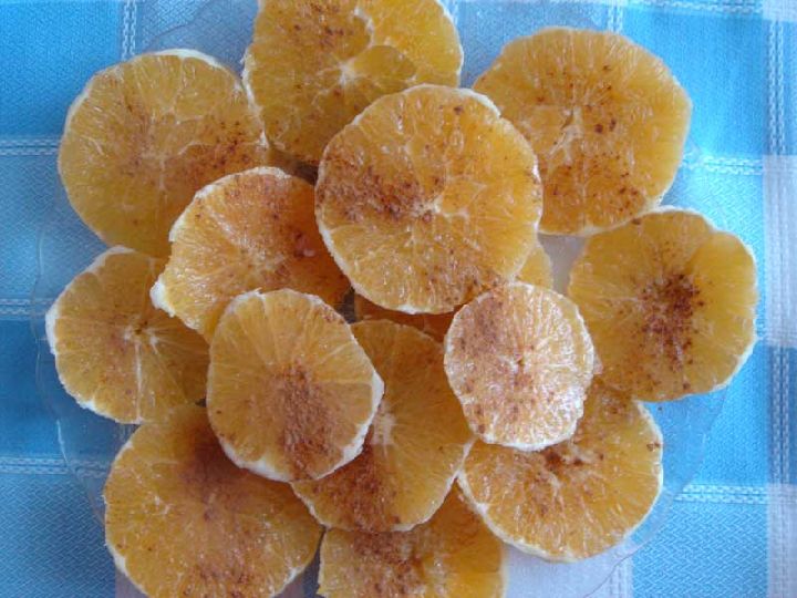 Por ello, para facilitar el consumo de naranja de los más perezosos a la hora de pelarla, aparte de comerla en crudo a gajos, podemos tomarla también cortada en rodajas y espolvoreada con canela molida y, si todavía está poco madura –dulce– de azúcar.