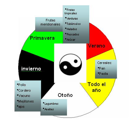 A la hora de establecer una dieta en nuestro entorno convendrá tener en cuenta la diversidad climática y estacional de nuestra naturaleza. Y así, aunque a nuestro cuerpo le gusta comer alimentos variados: fríos y calientes, húmedos y secos, nutritivos y descongestivos, ácidos y básicos, en general, cuando acaba el verano y llegan los primeros fríos hasta entrada la primavera convendrá proveernos de alimentos más yang , mientras que en épocas calurosas, nuestro cuerpo nos demandará alimentos yin -qué bien sienta un gazpacho bien fresquito cuando aprieta 'la calor'-.