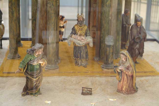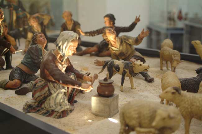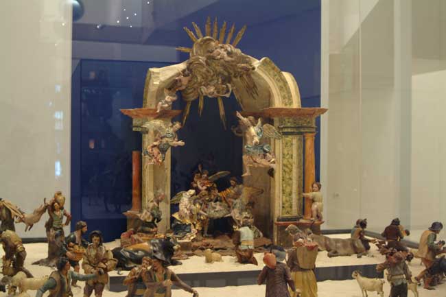 En el belén podemos observar pastores de remendadas ropas junto a unos magos deslumbrantes que se hacen acompañar de pajes vestidos con trajes dieciochescos; una nutrida guardia de Herodes y los grupos de la degollación de los Inocentes, en las que incluso el gesto y la nobleza de las expresiones delatan rangos militares e incluso sentimientos personales; el pilluelo que, encaramado en una de las columnas del pórtico toscano que le sirve de cobijo, contempla asombrado el Misterio que aparece ante sus ojos; los pastores que organizan su descanso nocturno tras la dura jornada, preparando un fuego que caldee la fría noche y sirva al mismo tiempo para asar carne con la que reponer fuerzas; la vieja que echa de comer a una manada de pavos, y de cuya boca parece brotar ese extraño y gutural sonido que durante siglos ha servido para llamar a las aves de corral quienes, incomprensiblemente, la entienden y acuden a recibir su alimento; el grupo de vacas que pastan bajo la soñolienta mirada del vaquero y en el que el artista plasma a una de ellas lamiéndose mansamente la pata, posiblemente herida por algún espino o picada por un tábano.